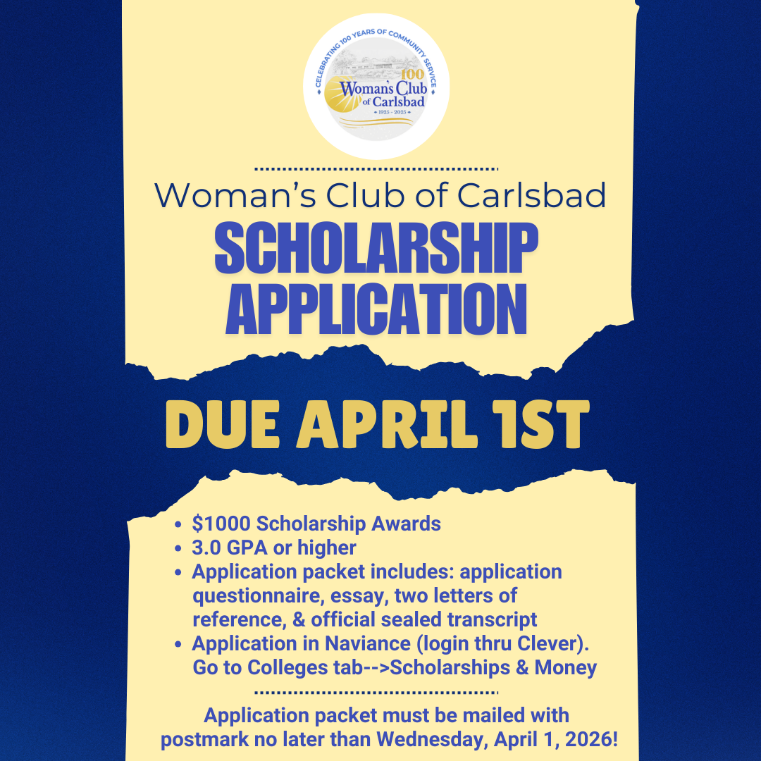 Scholarship: Woman's Club of Carlsbad $1,000 scholarship - Applications Due: April 1st, 2026