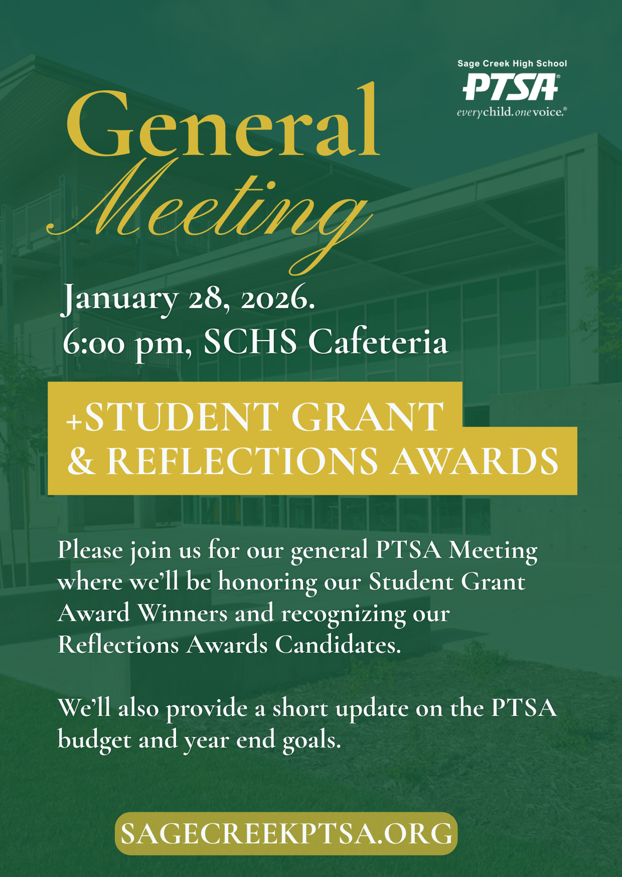 Hi Bobcat PTSA Families!Please join us tonight (Wednesday, January 28) at 6pm for the upcoming Student Grant and Reflections Award Ceremony and PTSA General Association Meeting in the Sage Creek Hi...