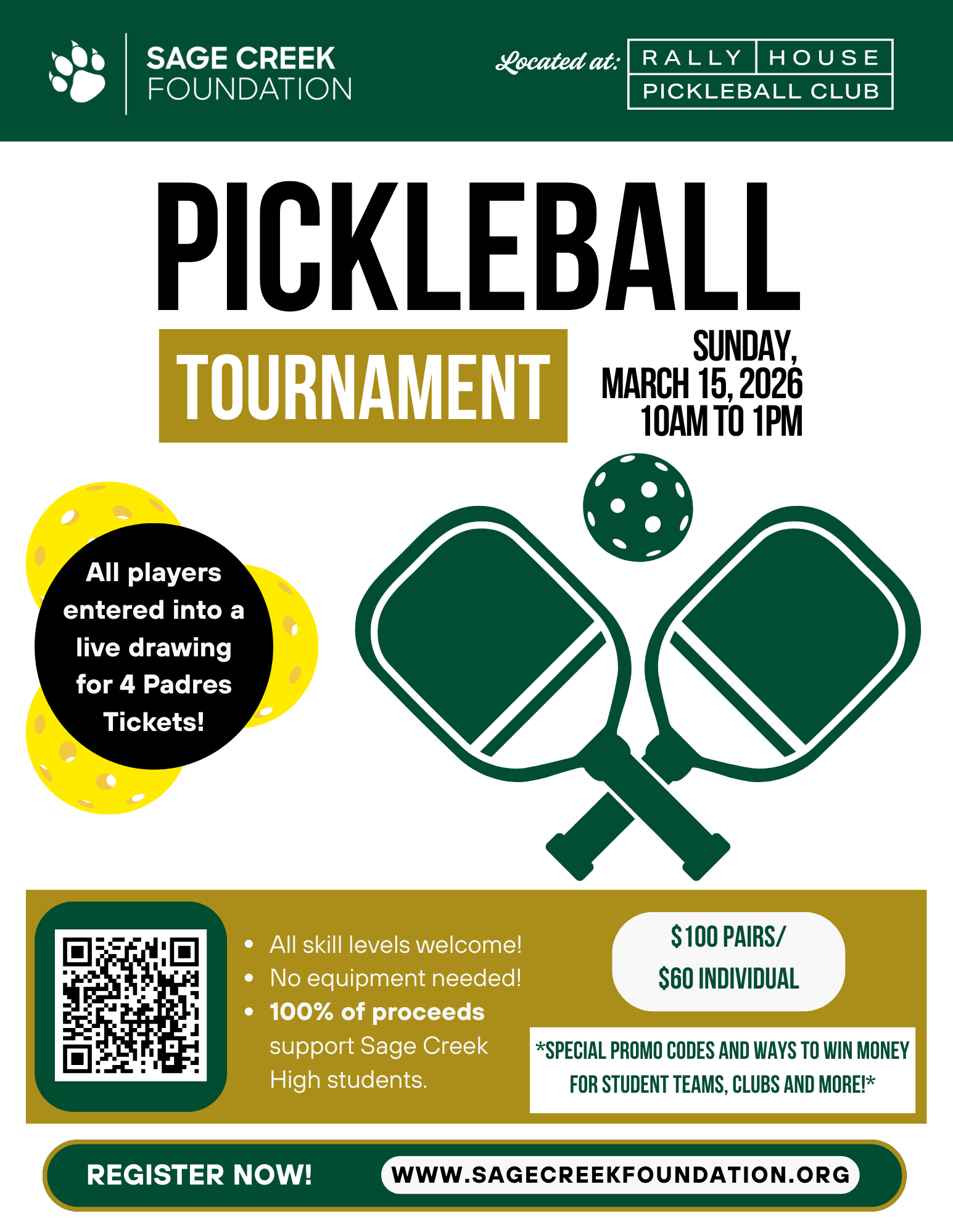 Sage Creek Families & Students, The Sage Creek Foundation's INAUGURAL Pickleball Tournament is just around thecorner! Sunday, March 15 | 10am – 1pm Rally House Pickleball Club Register: www.Sag...
