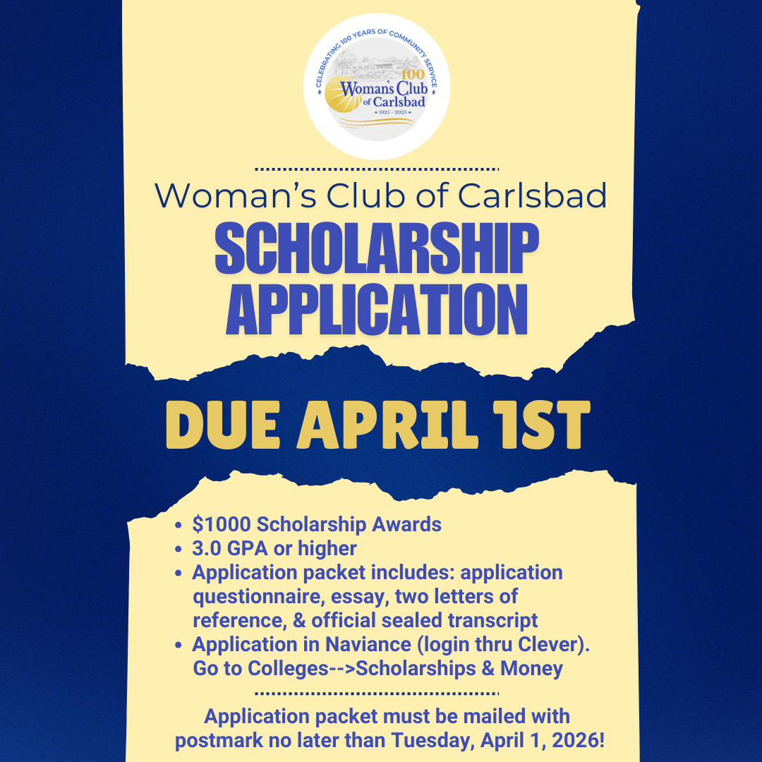 Scholarship: Woman's Club of Carlsbad Scholarship Application period is NOW OPEN! DEADLINE: April 1st, 2026