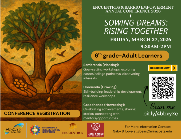 The 2026 MiraCosta Encuentros y Barrio Empowerment Annual Conference is coming up and registration is NOW OPEN!! Students in attendance will gain valuable, hands‑on opportunity to explore multiple ...