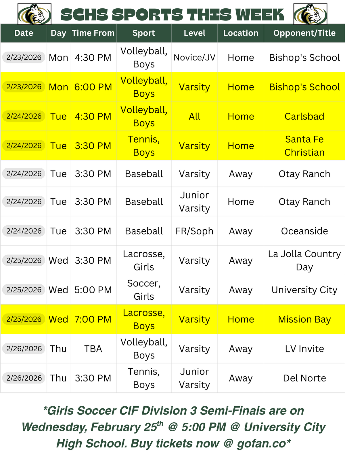 Club, Sports, and Team UpdateBoys Volleyball Game schedule for the Week -Monday at Home vs. Bishops -Tuesday at Home vs. Carlsbad JV and Novice start at 4:30 and Varsity Immediately after. Come sup...