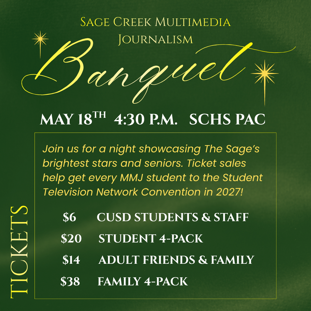 CLICK HERE: BUY YOUR TICKETS NOW! You're invited to Sage Creek Multimedia Journalism's First-Ever Banquet Fundraiser! Please join us for an evening showcasing The Sage’s brightest stars and sen...