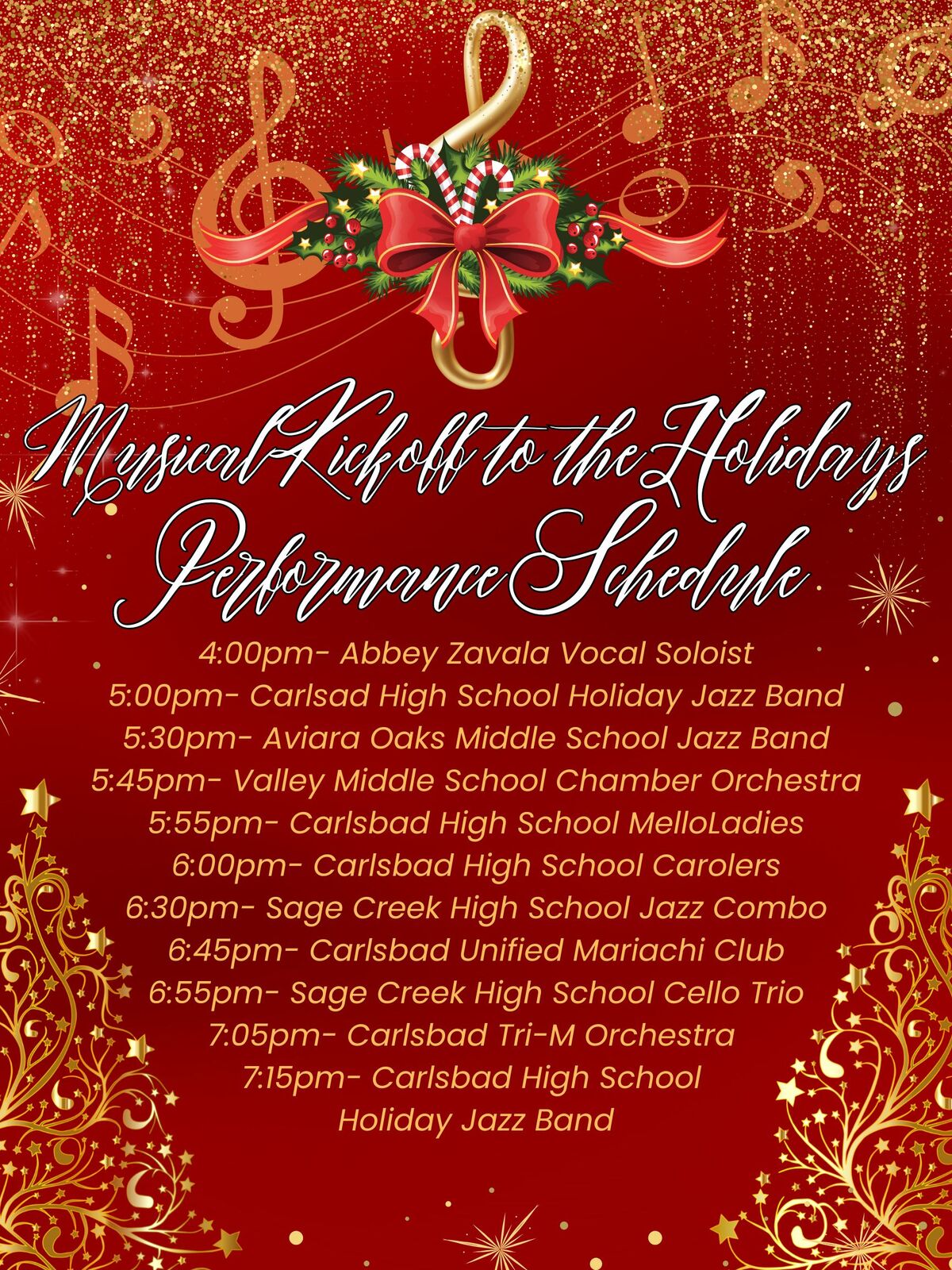 From 5-8pm there will be live performance by CUSD ensembles (See schedule below), sweet treats provided by Barrons, hot cocoa provided by Better Buzz, and holiday crafts provided by Carlsbad High School Tri-M Music Honor Society. Come kickoff the holiday season with the CUSD Music Departments!
